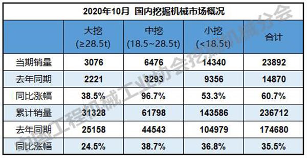 据中国工程机械工业协会统计,2020年10月纳入统计的25家挖掘机制造企业共销售各类挖掘机27331台,同比增长60.5%;其中国内23892台,同比增长60.7%;出口3439台,同比增长59.4%。